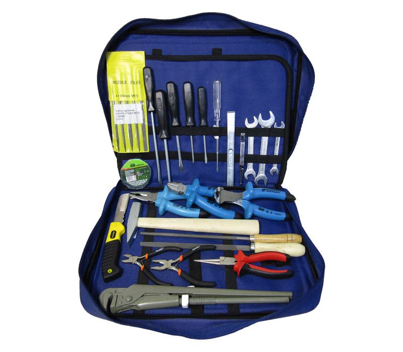 Набор инструментов электрика в сумке состоит из отверток шлицевых, крестовых, напильников, пробника электрического, набора надфилей, круглогубцев, ножа электрика складного, плоскогубцев, кусачек боковых, торцовых, бокорезов, зубила, изоленты ПВХ, ключей гаечных рожковых, пинцета, молотка и ключа трубного.